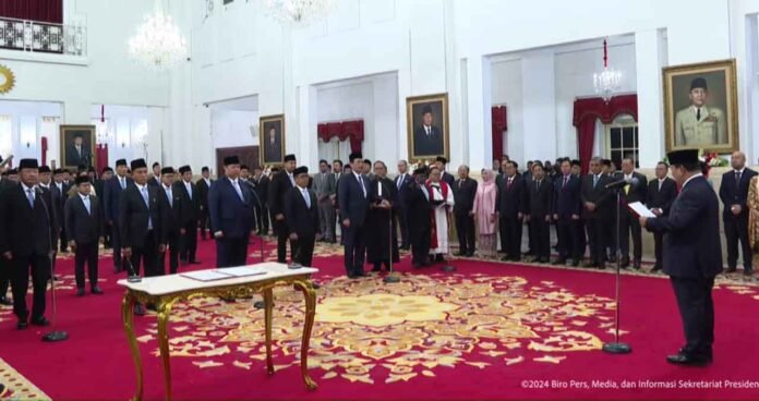 JAKARTA “tabloidnusantara.com” – Presiden Prabowo Subianto resmi melantik jajaran kabinet Merah Putih. Pada susuna kabinet Prabowo-Gibran ini, terdapat tujuh Menko, 41 menteri dan enam pejabat setingkat menteri. Pelantikan menteri digelar di Istana Negara, Jakarta, Senin (21/10/2024).