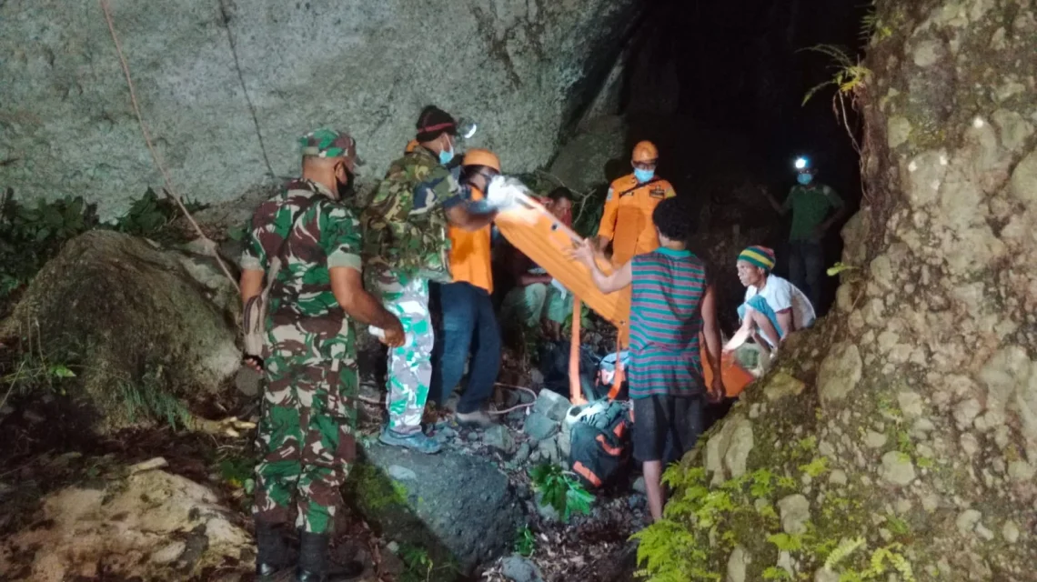 Alor, “TABLOIDNUSANTARA.COM” – Danpos Ramil Kokar Serka Natan Laan bersama Babinsa Serda Natan Ouwpoly dan anggota Unit Intel Kodim 1622/Alor Serda Mardona membantu evakuasi sosok mayat an. Agustina Demang (AD) usia 70 tahun yang ditemukan oleh Danpos bersama warga diatas tebing ditengah hutan, di Desa Dulolong Barat, Kecamatan Alor Barat Laut, Kabupaten Alor, Jumat sore (28/01/2022) pukul 17.00 Wita.