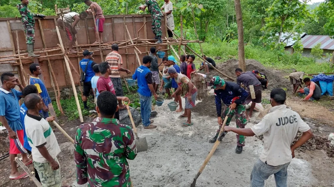 Walau terik matahari ikut menyengat dan embun malam membasahi tubuh, tidak membuat para prajurit bersama masyarakat kendor. Semua tampak bersemangat dengan adukan pasir, semen dan kerikil.
