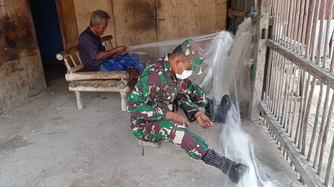 Selain memberikan himbauan, berbekal keahlian yang dimiliki Sertu Anwar, juga membantu memperbaiki alat tangkap atau pukat milik Bapak Hasan. (Kodim 1622/Alor)