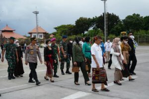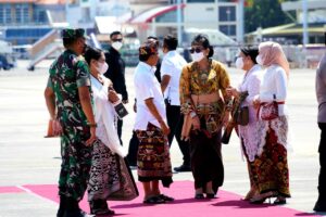 Setibanya di Bandara I Gusti Ngurah Rai Denpasar Bali dengan menggunakan Pesawat TNI AU, Hj. Wury Estu Handayani Ma’ruf Amin disambut oleh Gubernur Bali Dr. Ir. I Wayan Koster, M.M., didamping Kasdam IX/Udayana Brigjen TNI Brigjen TNI Harfendi, S.I.P., M.Sc., Wakapolda Bali Brigjen Pol Drs. I Ketut Suardana, M.Si., Danlanud I Gusti Ngurah Rai Bali dan Danlanal Denpasar beserta istri masing-masing.