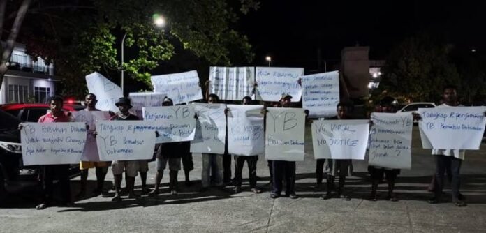Sekelompok pemuda ini membentangkan spanduk dan baliho yang diantaranya “YB palsukan dokumen untuk menjadi Cawagub ” lalu “Apa kabar Kapolda dan Bawaslu!”.