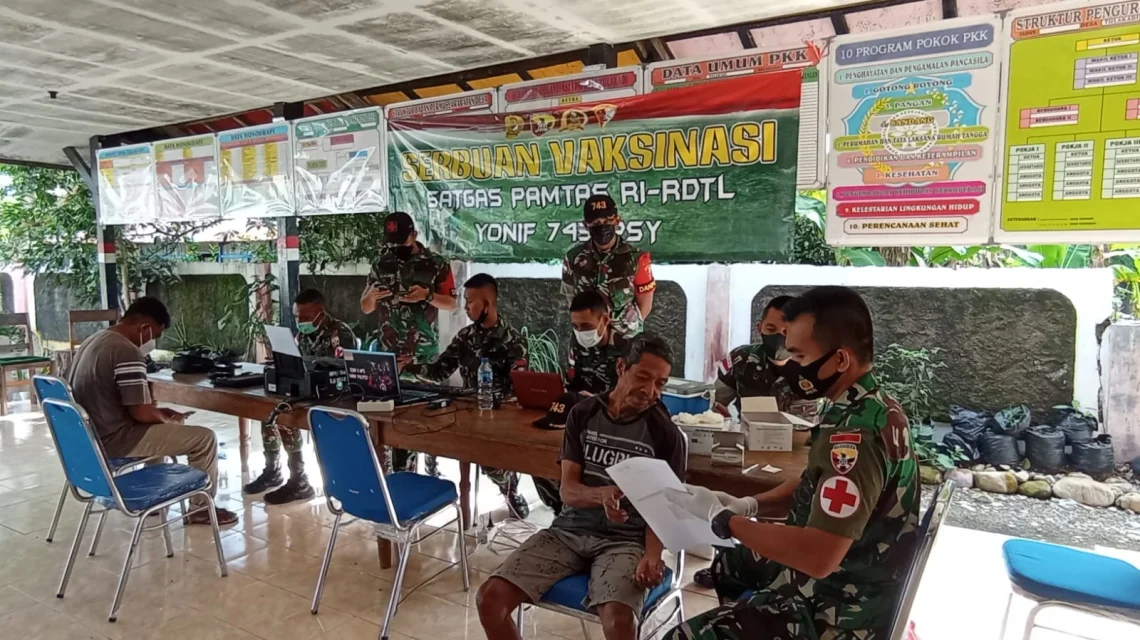 Belu, “TABLOIDNUSANTARA.COM” – Prajurit Satgas Pamtas RI-RDTL Yonif 743/PSY sebagai garda terdepan pengamanan perbatasan terus mendukung program pemerintah dalam memberikan vaksinasi Covid-19 untuk menghentikan penyebaran Covid-19.