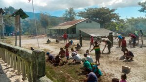Tampak terlihat di sekitar komplek Makoramil Weluli puluhan masyarakat baik pria maupun wanita, anak-anak hingga orang tua dengan penuh semangat dan antusias yang tinggi mengambil bagian dalam kegiatan kerja bhakti pembenahan pangkalan Makoramil tersebut.