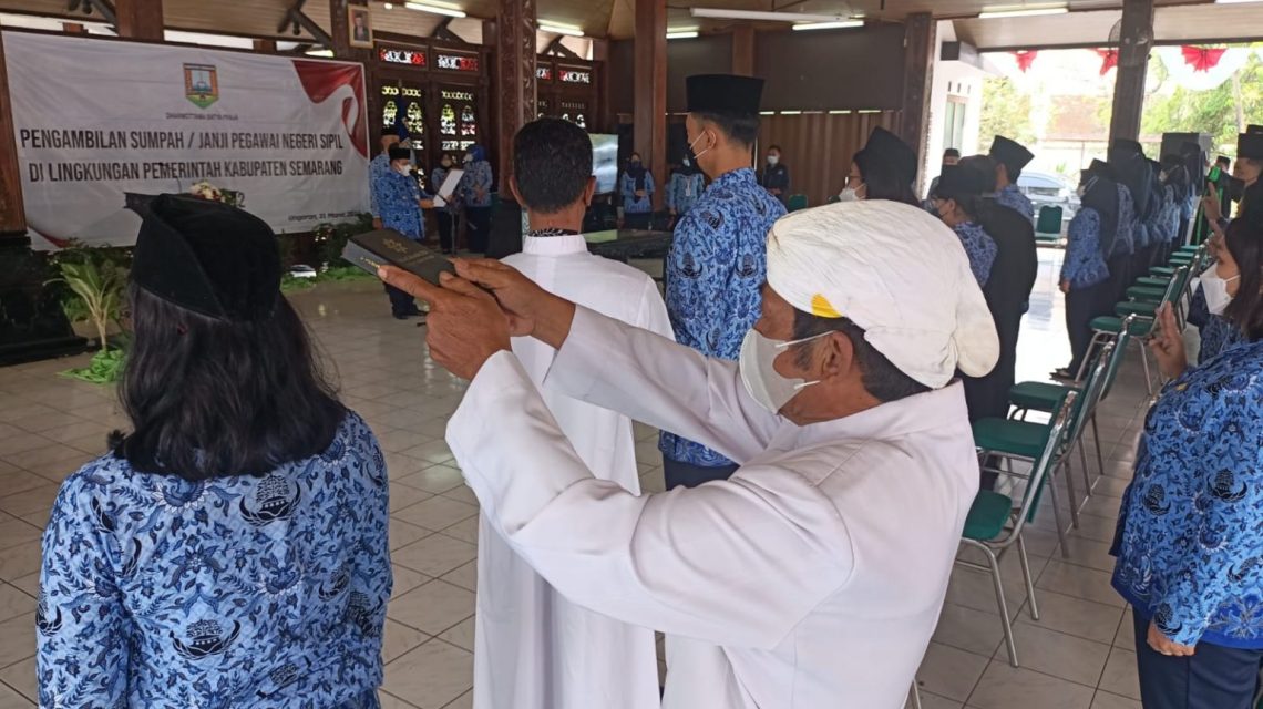 Kepala BKPSDM Kabupaten Semarang Wenny Maya Kartika menyampaikan, 100 orang PNS hadir langsung di pendapa rumah dinas bupati setempat, dan peserta lainnya mengucapkan sumpah janji secara online di lima tempat. Yakni, di aula Dinas Pendidikan di Suwakul, aula RSUD Gondo Suwarno Ungaran, Kantor Korwil Pendidikan Bergas, Ambarawa, dan Tengaran.