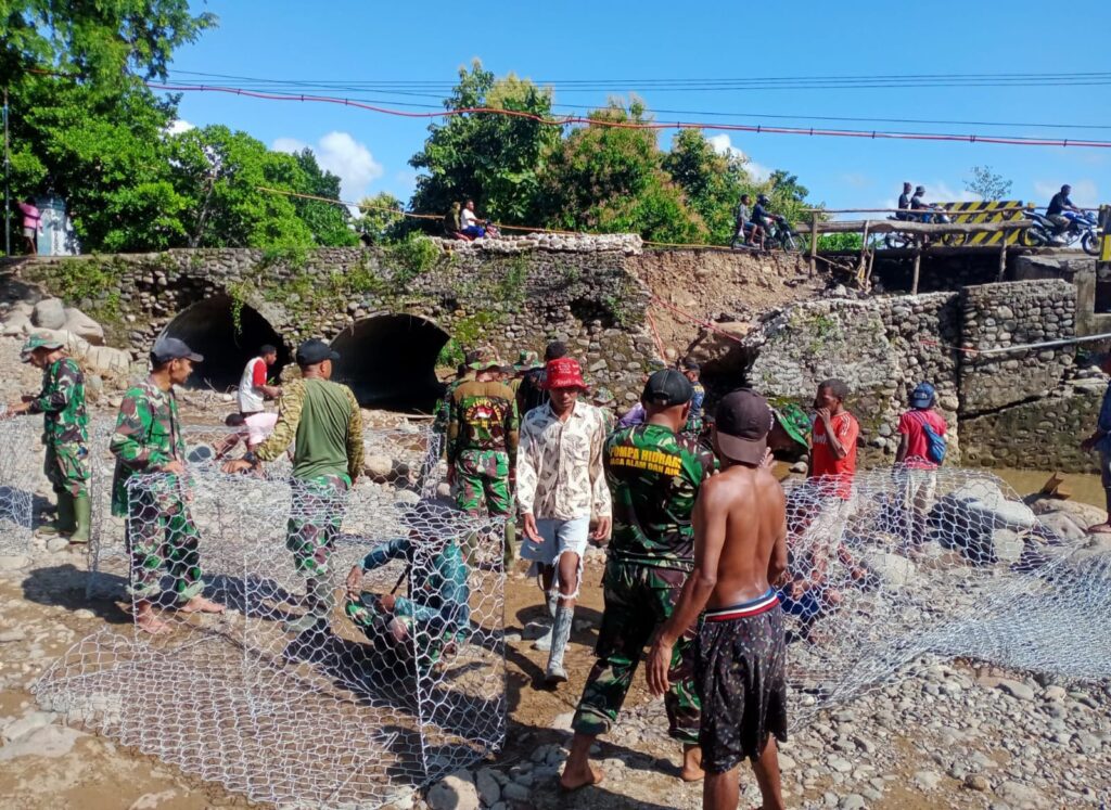 Danramil Kalabahi mengatakan bahwa para Prajurit bergotong royong melakukan pemasangan bronjong di Jembatan Sungai Pailelang guna mengatasi dan melancarkan akses arus lalulintas manusia amupun kendaraan roda dua dan empat.