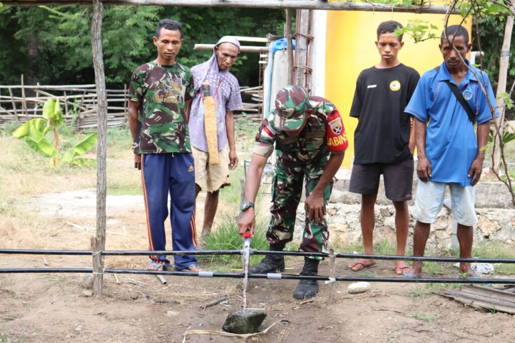 Menyikapi hal tersebut, Babinsa Koramil 1605-07/Wedomu Desa Silawan Serka Duarte Dos Santos bersama dengan Kelompok Tani Cahaya Libas Anggur membangun irigasi tetes di lahan anggur miliknya, pada Jumat (6/5/2022).