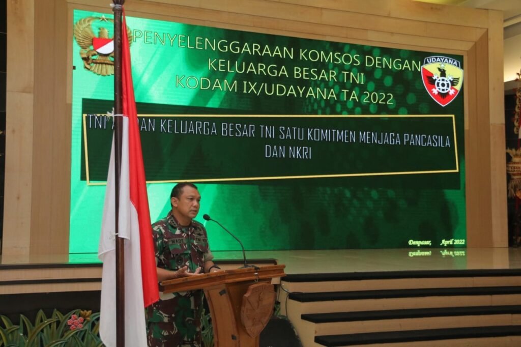 Denpasar, “TABLOIDNUSANTARA” – Kodam IX/Udayana melalui Staf Teritorial menggelar acara Komunikasi Sosial (Komsos) bersama Keluarga Besar TNI (KBT) tingkat Provinsi Bali dengan mengusung tema “TNI AD dan Keluarga Besar TNI Satu Komitmen Menjaga Pancasila dan NKRI,” pada Selasa (19/4/2022) bertempat di Aula Udayana Makodam IX/Udayana, Jalan Udayana No. 1, Denpasar.
