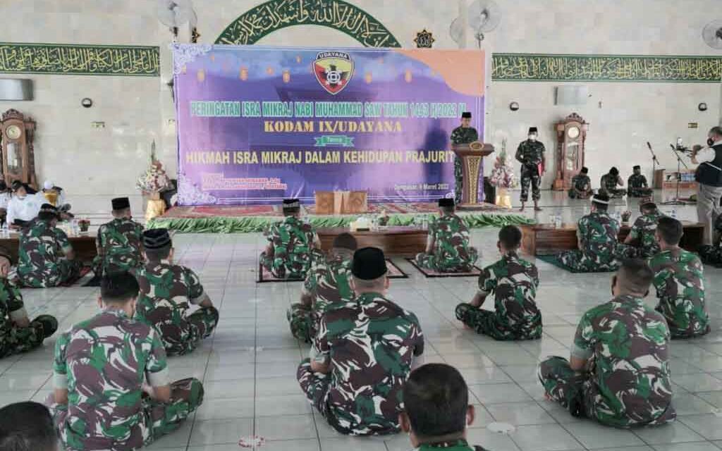 DENPASAR, “TABLOIDNUSANTARA.COM” – Pangdam IX/Udayana Mayjen TNI Sonny Aprianto, S.E., M.M., menghadiri kegiatan memperingati Isra Mikraj Nabi Muhammad SAW tahun 1443H/2022 M Kodam IX/Udayana di Masjid Agung Sudirman, Jalan Slamet Riyadi, Kecamatan Denpasar Barat, Kota Denpasar, dengan tema “Hikmah Isra Mikraj Dalam Kehidupan Prajurit TNI”, Rabu (9/3/2022).