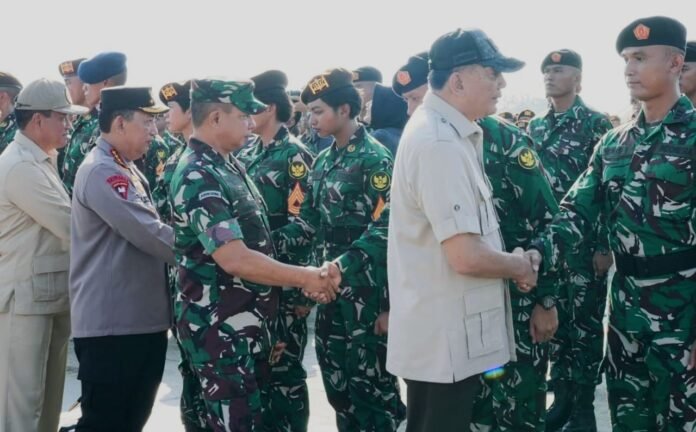 Menteri Pertahanan RI Bapak Sjafrie Sjamsoeddin didampingi Panglima TNI Jenderal TNI Agus Subiyanto, dan Kapolri Jenderal Pol Listyo Sigit mengucapkan selamat kepada personel Kontingen Indonesia Patriot II di Base Ops Halim Perdanakusuma, Minggu, (06/07/2025).