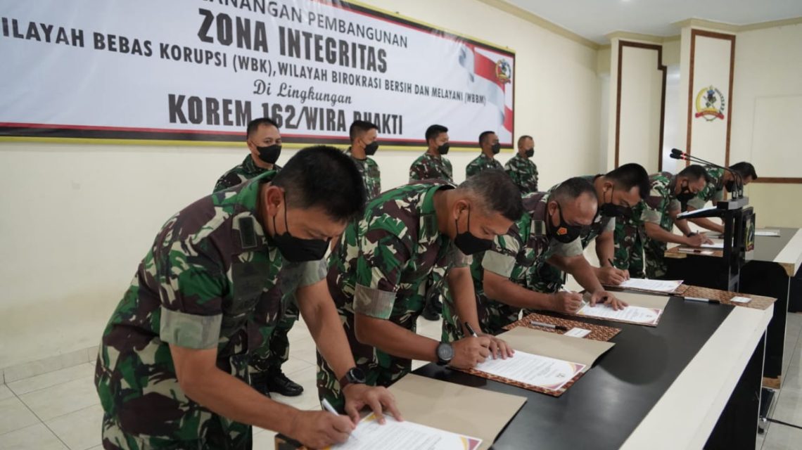 Dalam sambutannya Danrem mengatakan, bahwa pencanangan pembangunan zona integritas menuju WBK beserta WBBM di lingkungan Korem 162/WB merupakan suatu kesungguhan dan tekad dari Korem 162/WB dalam mengukuhkan diri sebagai bagian dari TNI Angkatan Darat yang mempunyai komitmen untuk mencegah terjadinya praktek KKN disertai dengan upaya untuk mewujudkan wilayah bebas korupsi serta reformasi, birokrasi yang transparan akuntabel disatker maupum subsatker jajaran Korem 162/WB.