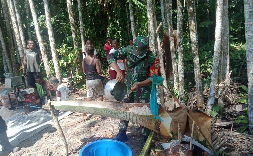Tak lepas dari itu peran seorang babinsa dalam membangun kesejatraan di wilayah binaan sangatlah penting, seperti kegiatan yang Serda Patrik dudo lakukan ini sangatlah membantu bagi kepala suku demi mempercepat selesainya pengolahan sagu tersebut.