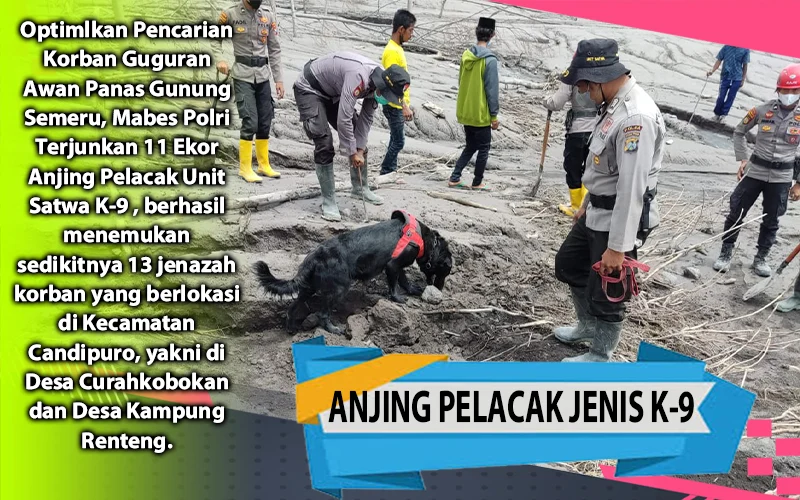 “Dimana sejak hari kedua operasi pencarian Polri mengerahkan 11 ekor anjing pelacak Unit Satwa K-9, berhasil menemukan sedikitnya 13 jenazah korban, pencarian berlangsung pada Minggu (5/12/2021) hingga Senin (13/12/2021).