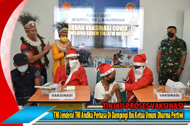 MERAUKE, “TABLOIDNUSANTARA.COM” – Dihari kedua dalam kunjungan kerjanya di wilayah Merauke, Panglima TNI Jenderal TNI Andika Perkasa beserta rombongan melaksanakan peninjauan secara langsung vaksinasi Covid-19 untuk masyarakat baik dewasa maupun anak-anak, bertempat di Rumah Sakit Jenderal TNI L. B. Moerdani jalan poros Tanah Miring, Distrik Tanah Miring, Kabupaten Merauke, Rabu (22/12/2021) .