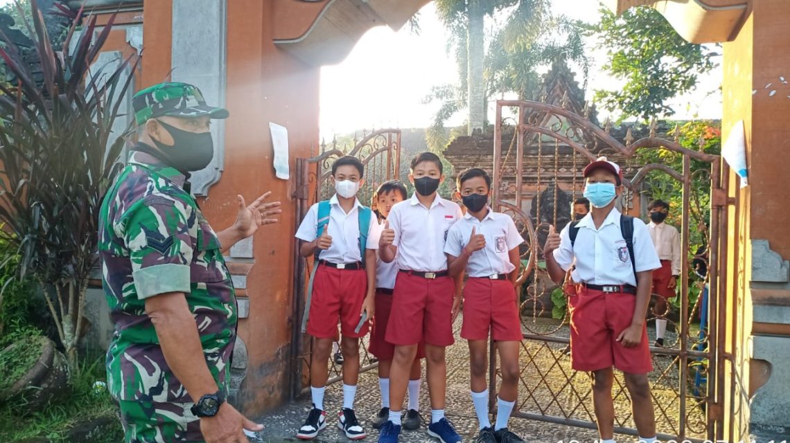Terkait hal tersebut, personil Koramil 1626-03/Tembuku Babinsa Desa Bangbang, Sertu I Kt Wenyen Adnyana menyambangi Sekolah yang ada di Desa Binaannya, pada Selasa (13/4/2022).