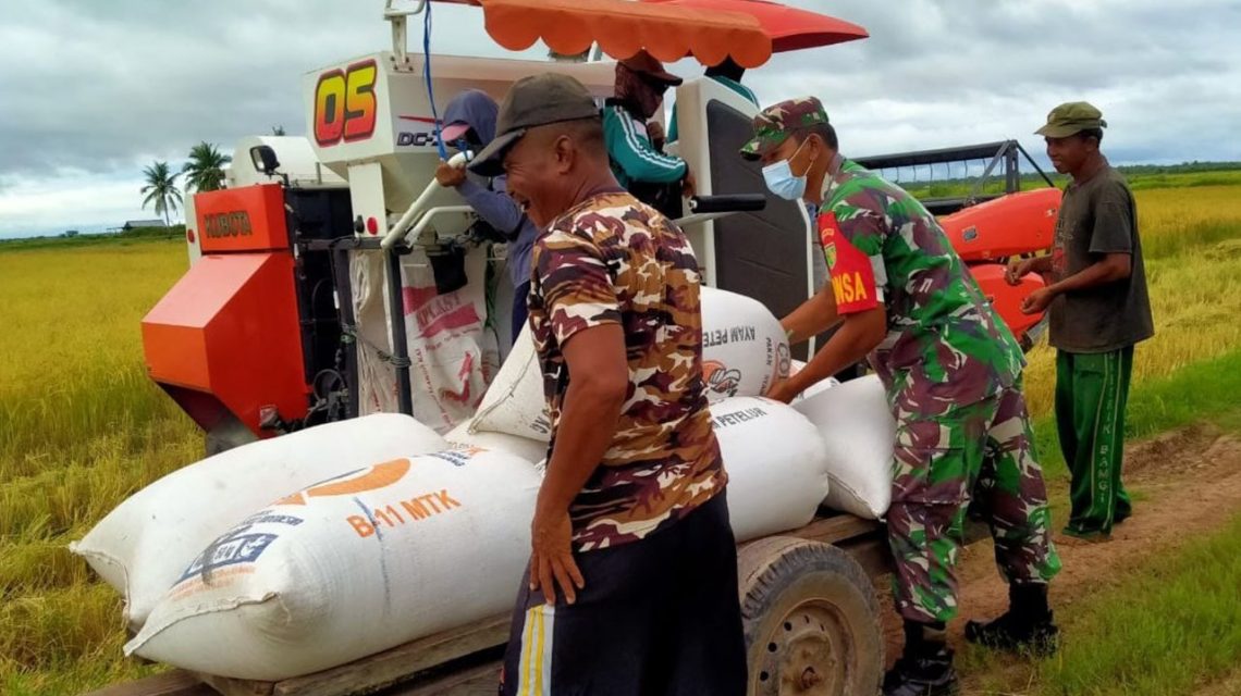 MERAUKE, “TABLOIDNUSANTARA.COM” – Babinsa Pos Ramil Malind, Koramil 1707-05/Merauke, Sertu Totok Kasmianto bersama petani panen padi milik pak Peno (50) warga Kampung Sumber Mulya, Distrik Malind, Kabupaten Merauke, Selasa (22/2/2022).