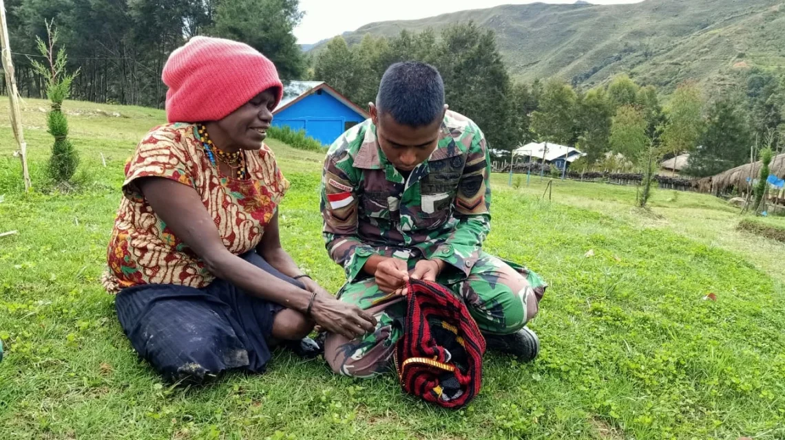 PRAJURIT SATGAS 412 KOSTRAD BELAJAR MEMBUAT NOKEN BERSAMA MAMA MAMA DI PEDALAMAN PAPUA
