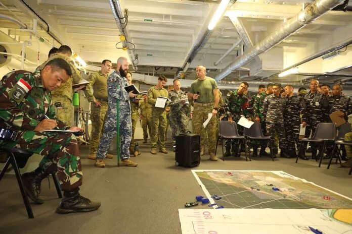 SITUBONDO, “ https://tabloidnusantara.com/ ” – Prajurit KRI Makassar-590 dari Satuan Kapal Amfibi Koarmada II dan KRI Raden Eddy Martadinata-331 dari Satuan Kapal Eskorta Koarmada II, yang tergabung dalam Latgabma Keris Woomera 2024, mengikuti kegiatan Rehearsal of Concept (ROC) yang diselenggarakan di atas kapal HMAS Adelaide, di perairan Banongan, Situbondo, pada Senin, (11/11/2024).