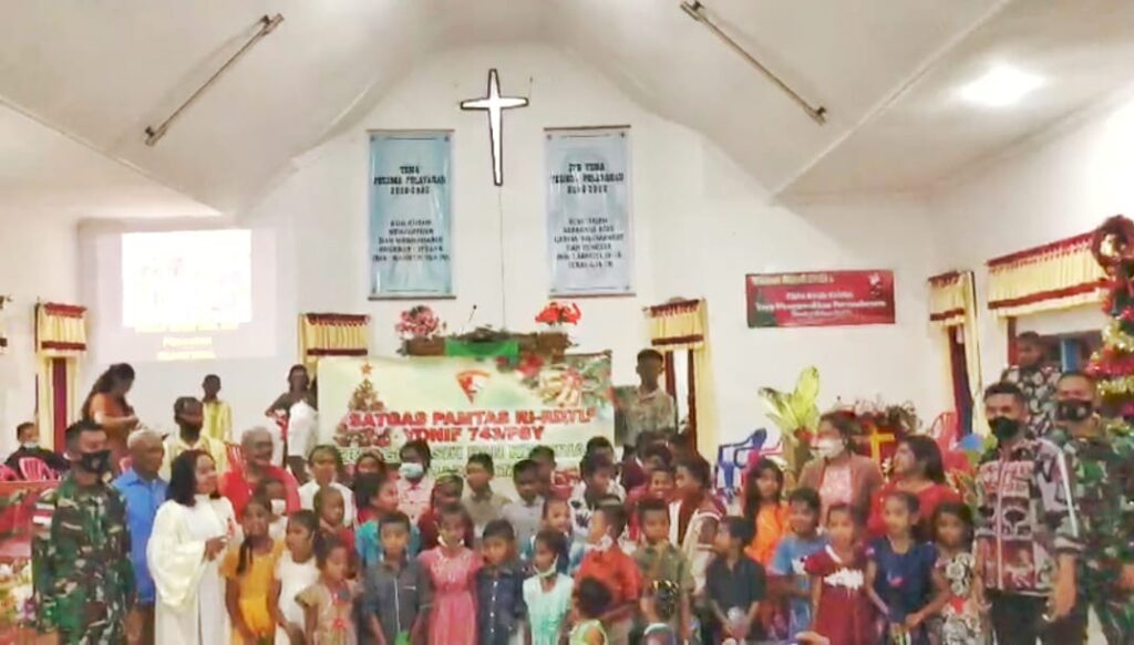 TTU, “TABLOIDNUSANTARA.COM” – Satgas Pamtas RI-RDTL Yonif 743/PSY Pos Kout melaksanakan pengamanan Natal dan berbagi kebahagiaan dengan memberikan Kado Natal kepada Anak-Anak di Desa Eban, Kecamatan Miomaffo Barat, Kabupaten Timor Tengah Utara, pada Sabtu (25/11/21).