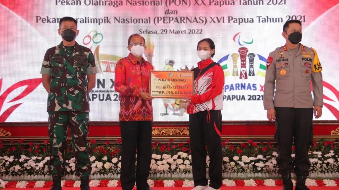 Denpasar, “TABLOIDNUSANTARA” – Sebagai wujud perhatian dan apresiasi kepada Atlet yang memperoleh medali emas, perak dan perunggu dalam ajang PON XX Papua, Pemerintah Provinsi Bali memberikan penghargaan untuk para atlet, pelatih, ketua kontingen dan ketua Pemusatan Latihan Daerah (Pelatda) PON XX Papua Tahun 2021 dan Pekan Paralimpik Nasional (Peparnas) XVI Papua Tahun 2021.