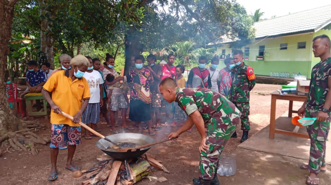 SOTA, “TABLOIDNUSANTARA.COM” – Prajurit Satgas Pamtas Yonif 123/RW Pos Barki dan Pos Toray memperkenalkan dan mengajarkan cara membuat Dodol yang berbahan dasar tepung ketan kepada masyarakat perbatasan di Kampung Toray Distrik Sota, Merauke, Selasa (22/02/2022).