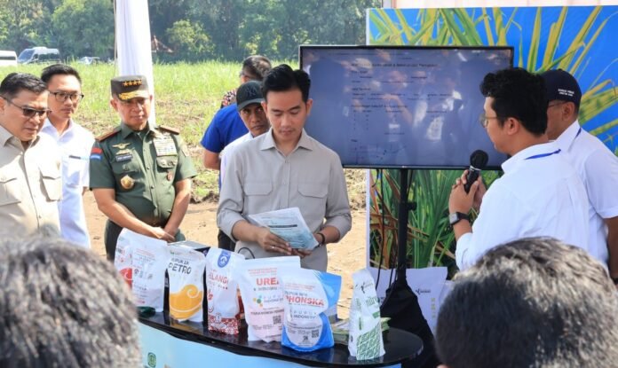 Wapres Gibran Rakabuming Raka didampingi Panglima TNI sedang melihat pupuk tanaman di acara Panen Tebu di Sleman.Jawa Tengah, Selasa (8/7/25)